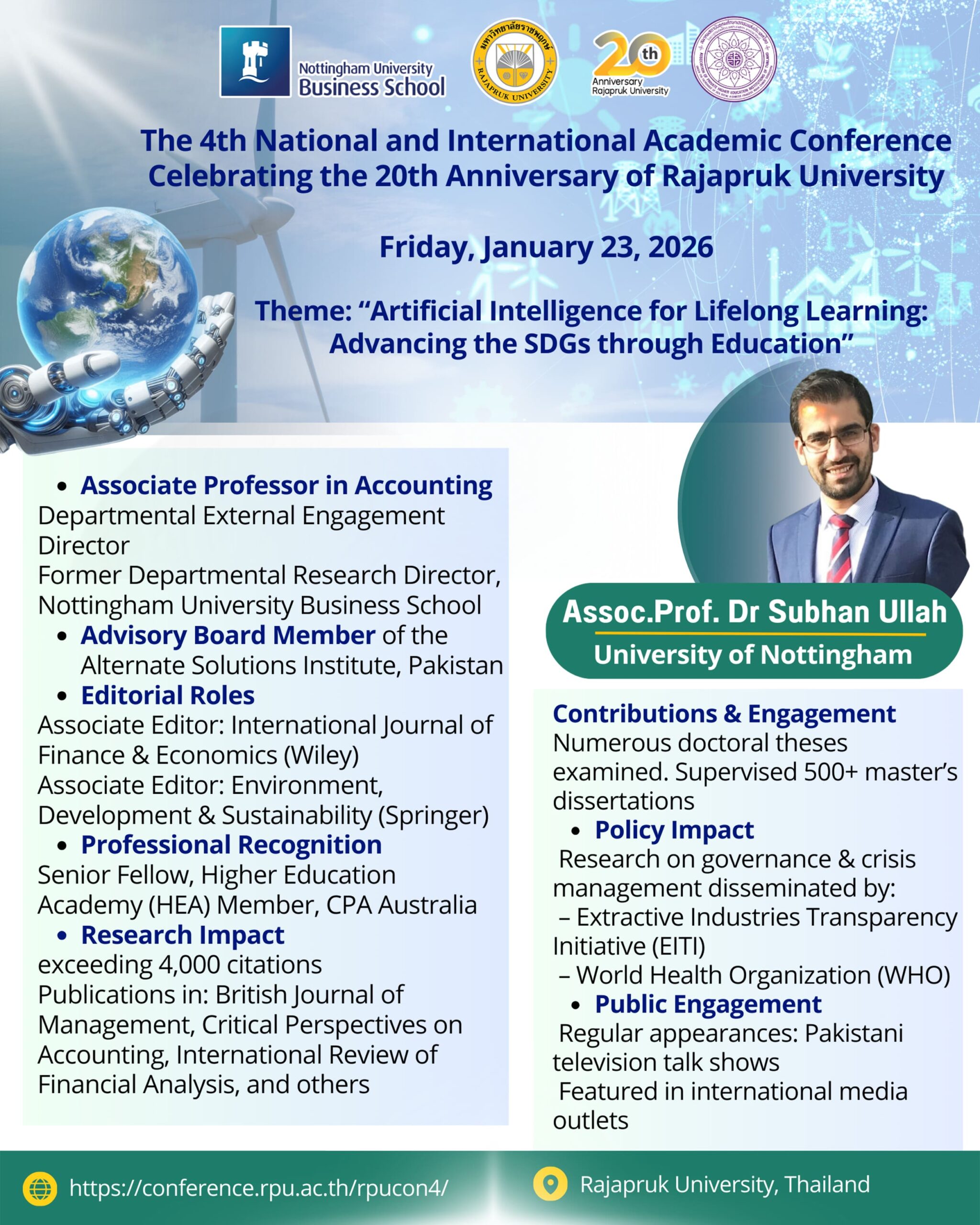 09:00 – 10:00 น. | Keynote Address Topic : “Climate Literacy for All: Integrating Climate Change and Sustainability Across the Curriculum” Keynote Speaker : Assoc. Prof. Dr. Subhan Ullah |